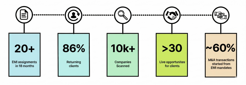 By integrating structured frameworks with iterative client collaboration, EMI ensures that market mapping evolves in line with strategic priorities, creating a competitive advantage in unearthing hard to find acquisition targets across sectors and geographies. This technology-enabled methodology accelerates the early-stage M&A process while maintaining the flexibility to adapt to complex client needs.